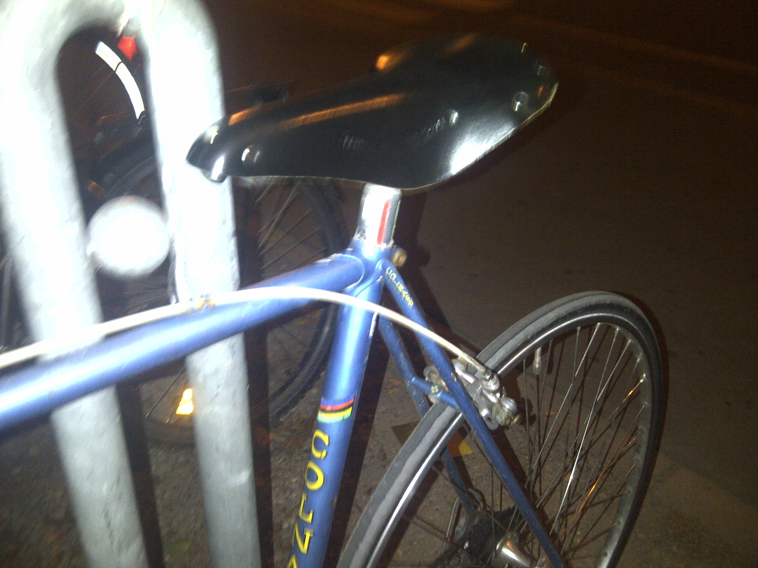 I was in Zurich recently for a short stay, and I’m impressed with the cycle culture there,a lot of vintage road bikes with gears and a flat bar set up, I saw a Gios, De Rosa, Eddy Merckx and 4 Colnagos, including a Master in Isotar decor and C record gruppo with delta’s all being ridden quite nonchalantly… when I went out for a drink one evening, I came across this locked to a post in the dark..a vintage Colnago Super,
