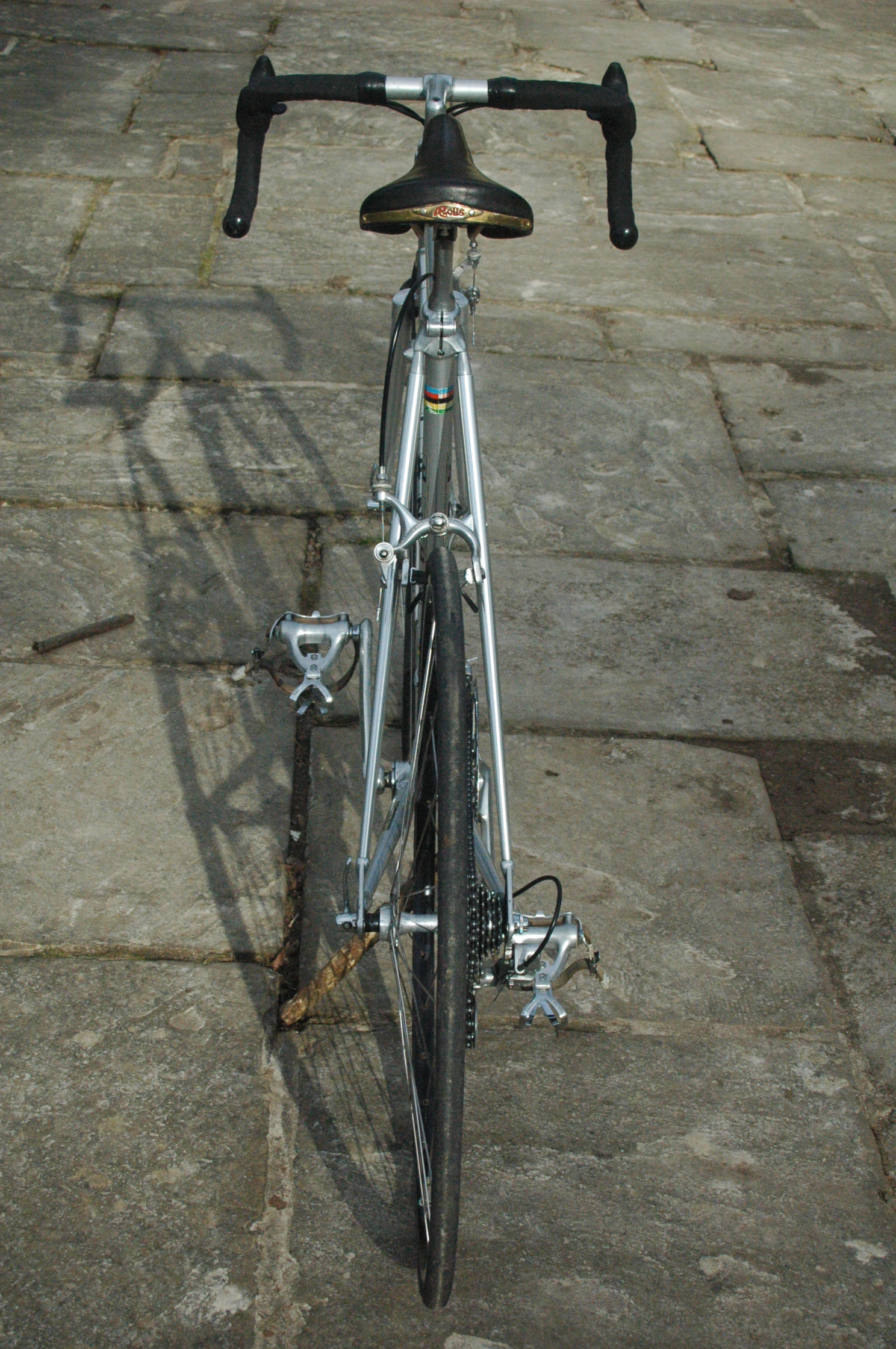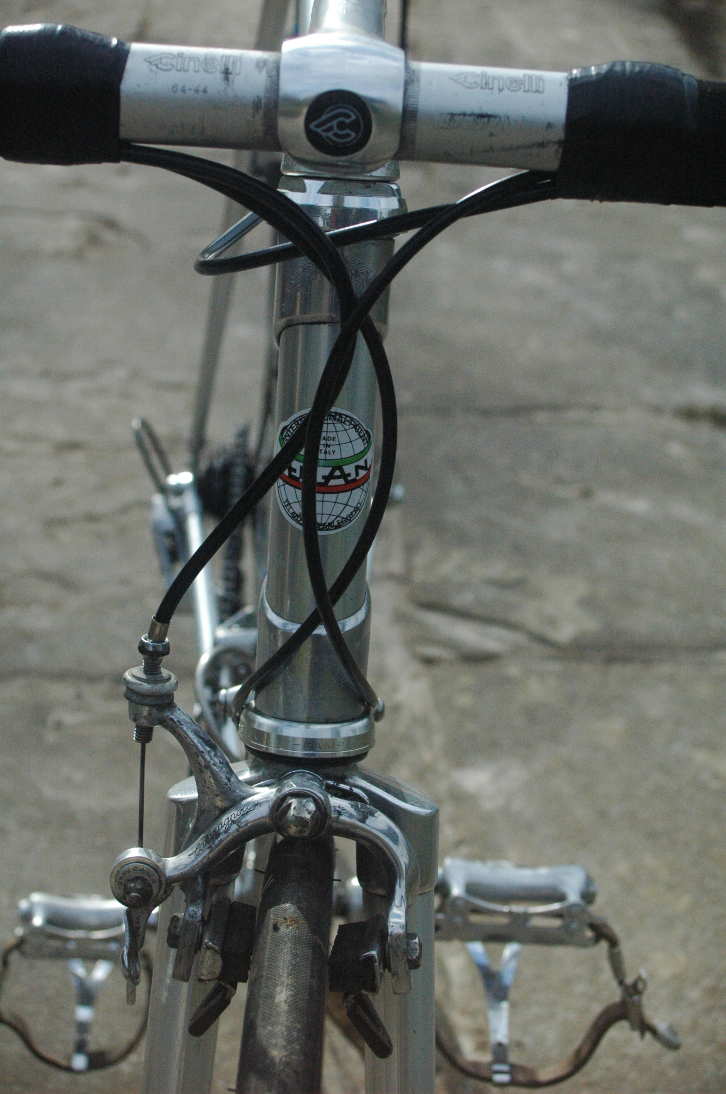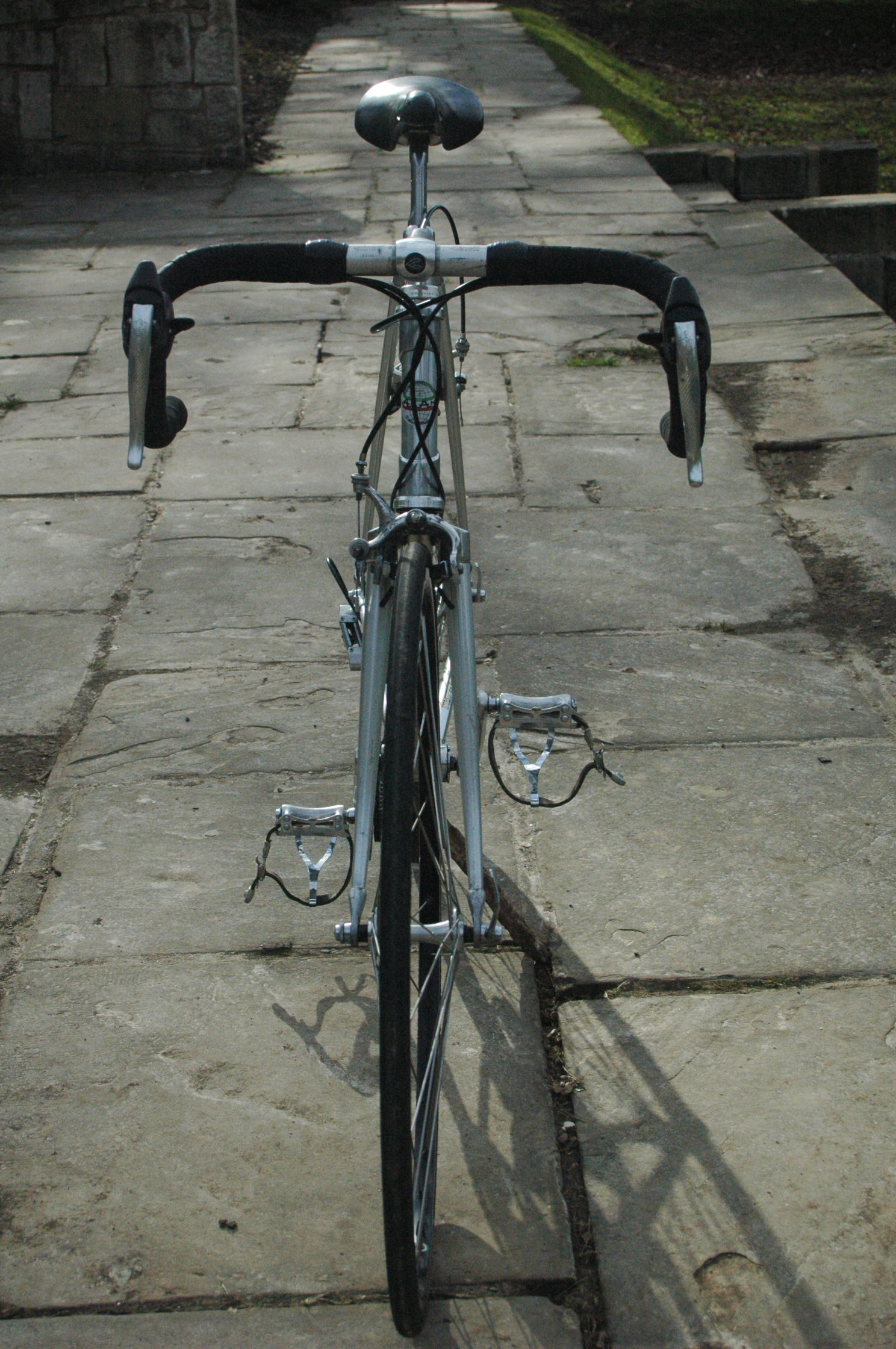 The Campagnolo “brifters” are in fact 8 speed, which would need 130mm rear spacing, or an OLD hub,but they are also compatible with a 7 speed freewheel, which is what I made do with until I make a suitable 8 speed wheel set…here’s some more pictures with Campagnolo Victory toe cage pedals…
