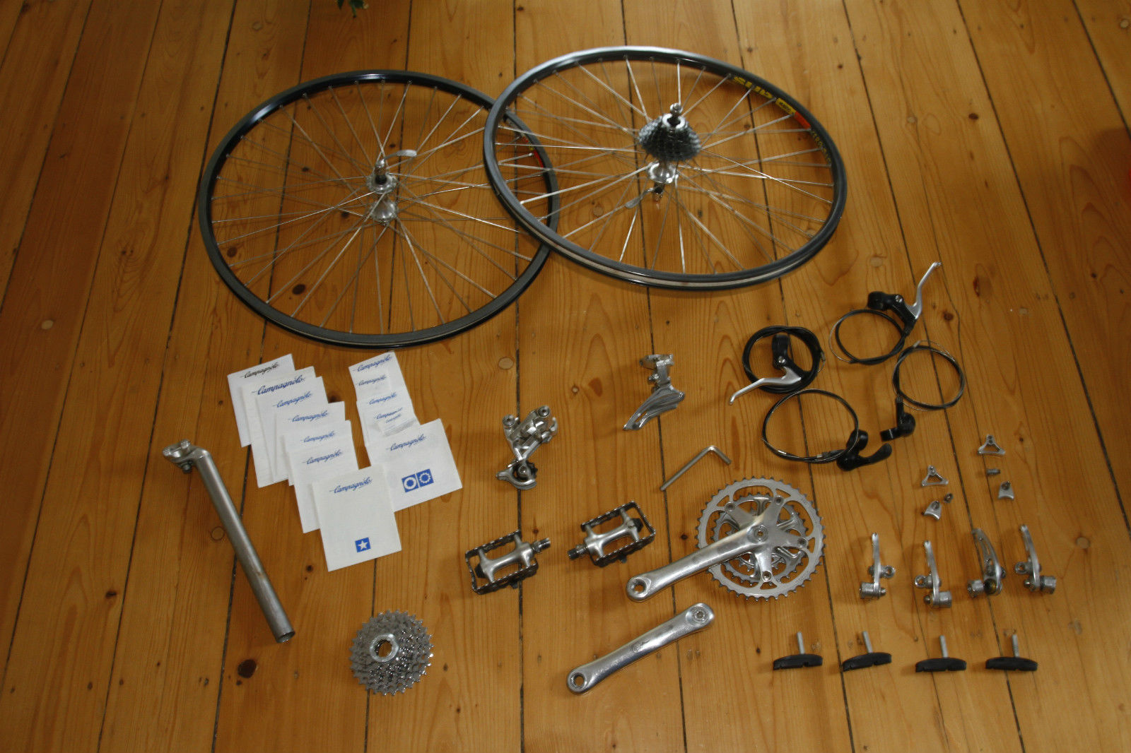 Decor is a black satin finish over what appears to be chrome, quite worn, so I have a used Campagnolo Record O R gruppo I will mount on it…