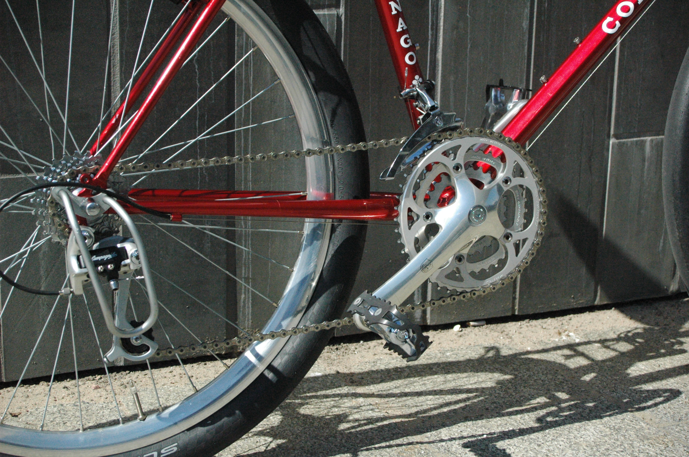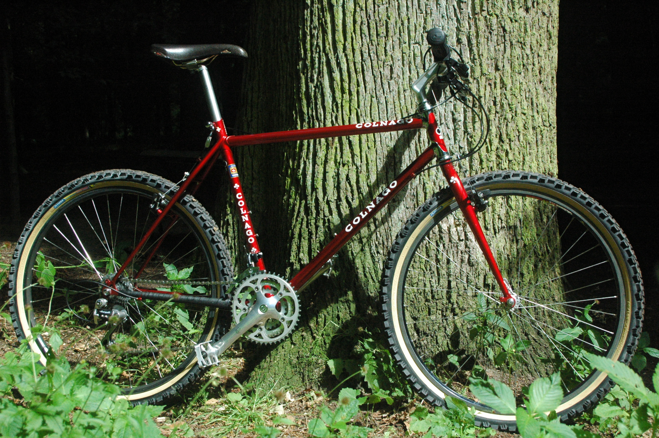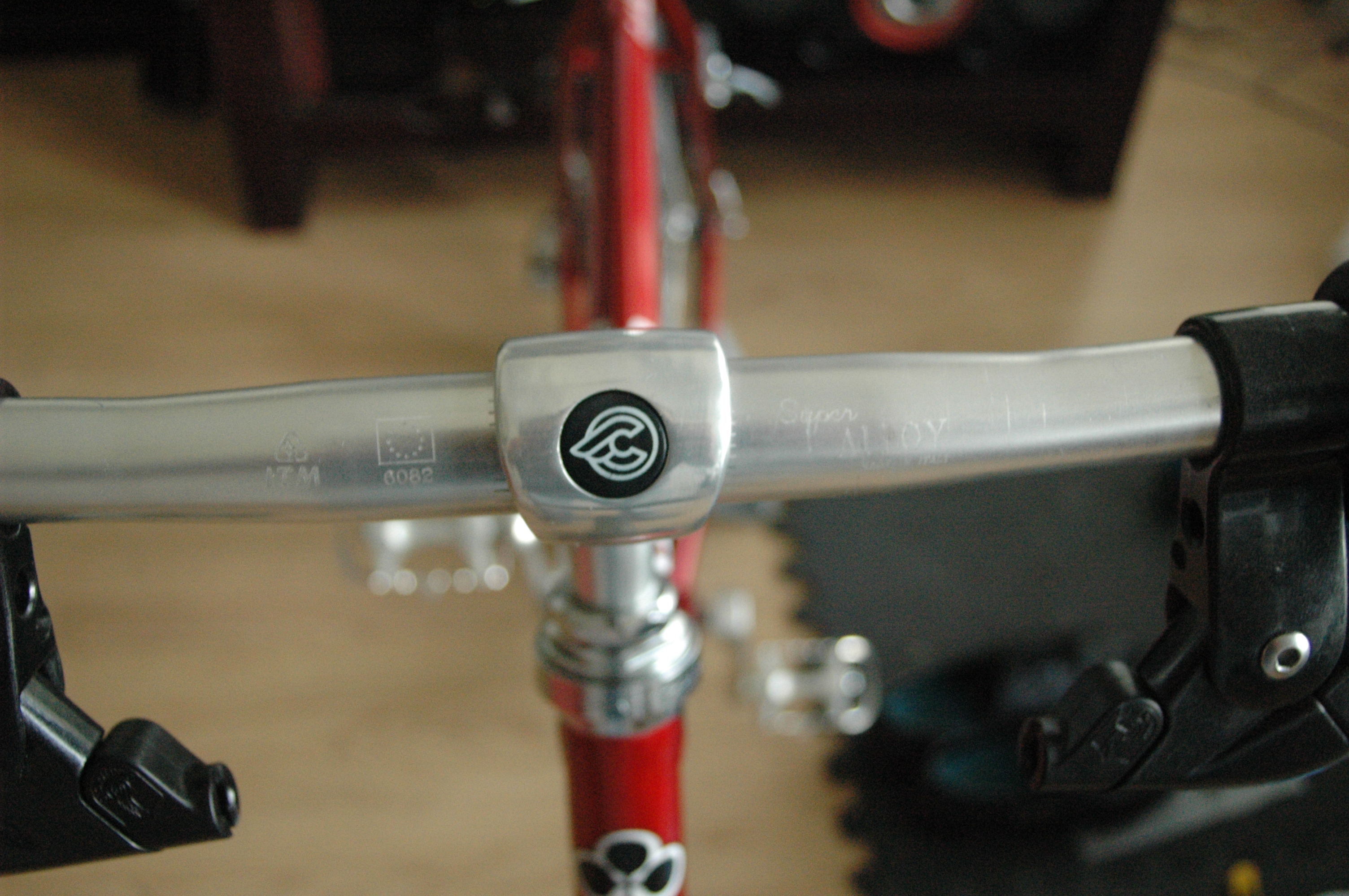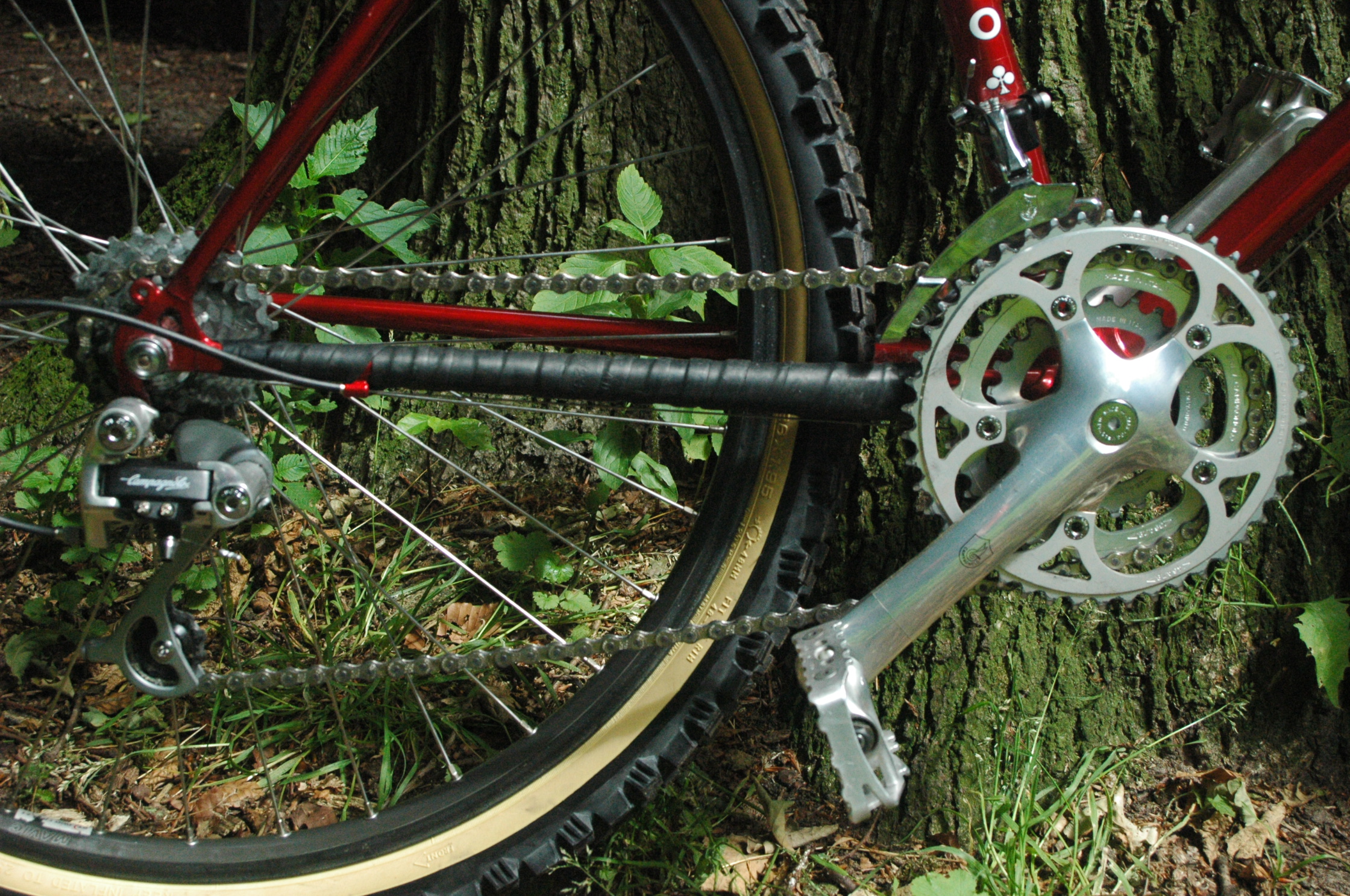 I found set of nos Tioga Psycho tyres, so I borrowed the wheelset from The Next Machine, (Campagnolo O R on Mavic SUP Ceramic rims) until I finish building a set with Campagnolo rims and Olympus MTB hubs..